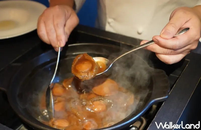 ▲主廚蔣文正於桌邊料理南非鮑魚/ WalkerLand窩客島整理提供