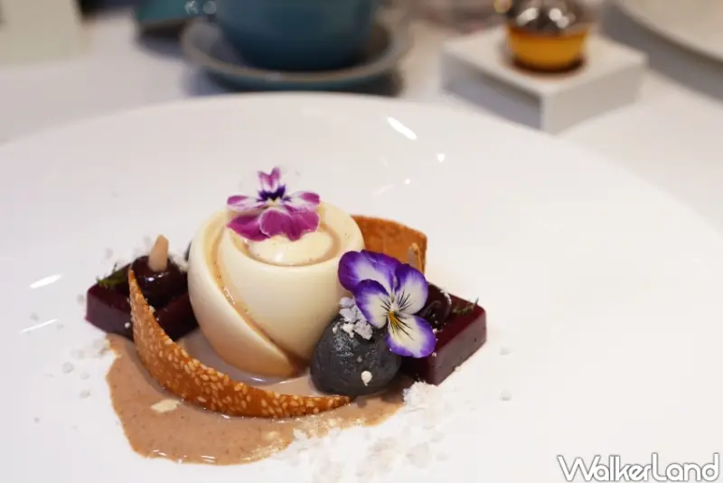 「冬藏潤養」是一道擁有西式外觀、中式靈魂的甜點,以杏仁慕斯為主軸,搭配以核桃露蒸煮的核桃醬、芝麻脆片、芝麻凝膠,以及酒漬櫻桃製成的果凍,質地樸質自然,為這場雙主廚四手聯彈的秋冬盛宴畫上最餘韻悠長的句點。