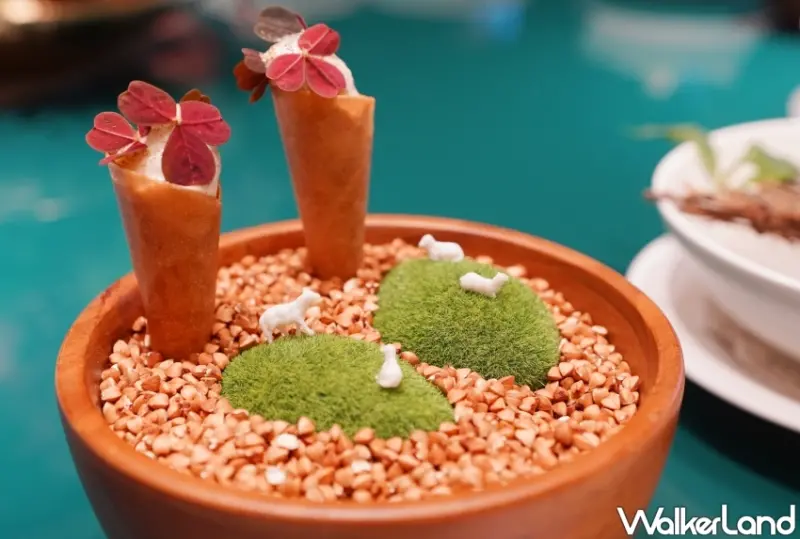 開胃小品「寒露煦意」,將混合腰果、數款辛香配料熬煮而成的瑪莎拉咖哩醬汁,填入慢火爐烤至薄脆的春捲皮,加上羊奶、紅茶與馬茲卡彭起司藉由氮氣加壓製成綿密細緻的泡沫奶蓋,瑪莎拉咖哩獨特的辛香味與羊奶紅茶巧妙融合。![]()