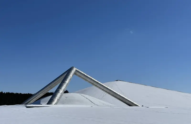 鋼骨三角錐與土台(TETRAMOUND PLAZ/テトラマウンド廣場)是公園重要的大型雕塑藝術作品之一,由三座鋼製三角錐形結構組成,隨光線與天氣變化呈現不同氛圍,繞行雕塑,拍攝不同角度的對稱美,特別是在冬季,鋼結構在雪地中的反光效果,與陰影、積雪與周圍林地融為一體,格外迷人,也很有科技未來感的美學。![]()