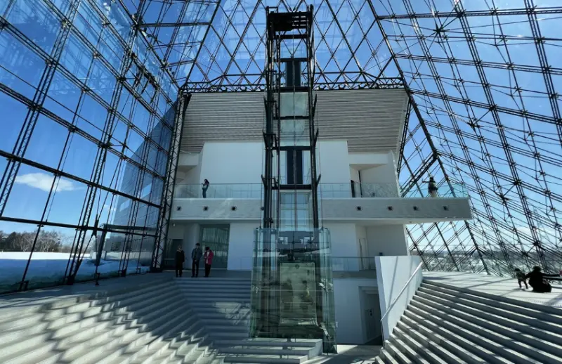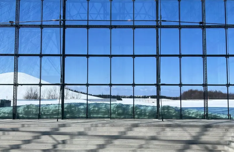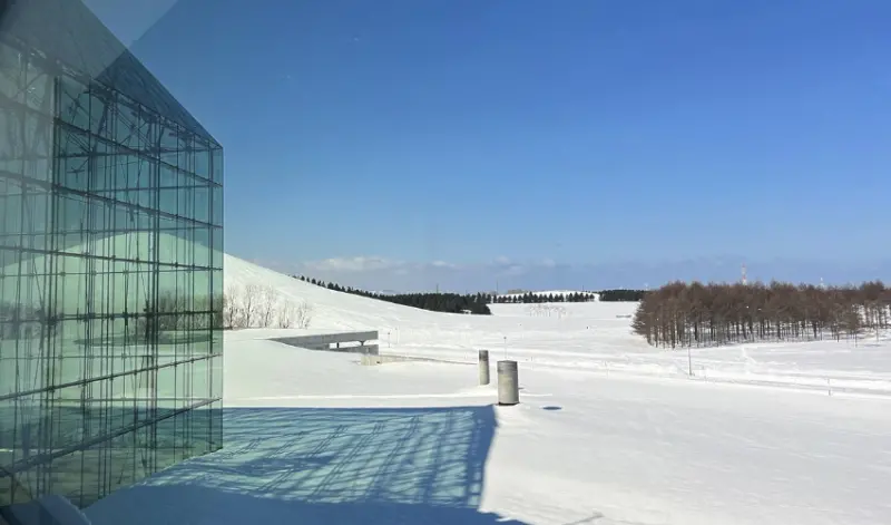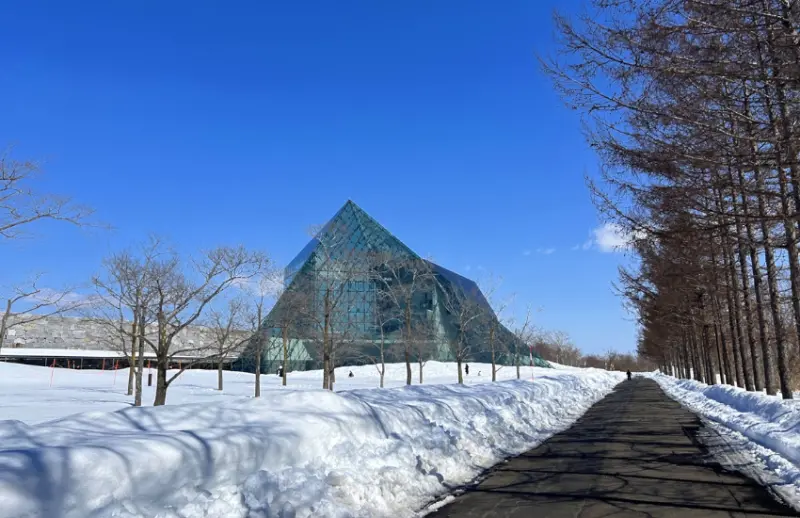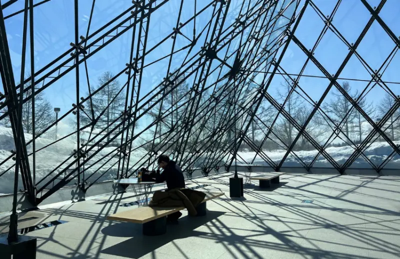 如果說公園的開放空間提供了北國的壯闊,那麼玻璃金字塔則為人們帶來了北海道冬日裡難得的溫暖與靜謐。遠處看見玻璃金字塔(Glass Pyramid – HIDAMARI),晶瑩剔透的結構在雪地閃耀,像是一座未來感十足的宮殿;他是園內最大建築,作為一個多功能建築空間,建築內部包含展覽空間、咖啡廳、禮品店和觀景台,內部溫暖開闊,玻璃的透光性使得陽光與雪景自由穿透入室,如畫般展現在眼前,不只是入內參觀者,也有不少在此閱讀、工作的人,我跟著坐著坐著,實在也不願離開了。![]()