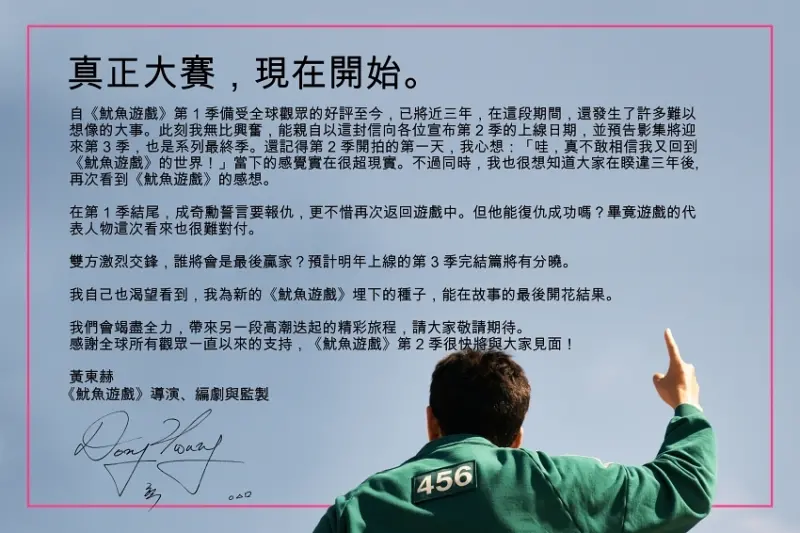同時,近日公布的「魷魚遊戲」第2季海報也成為焦點。海報中,參賽者們在一個神秘的圓形舞台上奮力衝刺,背景中不僅有象徵遊戲的旋轉木馬,還強調了新一輪遊戲的緊張感和危機四伏的情勢。成奇勳站在最前方,目光堅定,帶領著玩家們向未知的目的地前進,這一幕不僅象徵著遊戲的開始,也昭示著接下來將會有更多驚心動魄的挑戰和出乎意料的劇情發展。