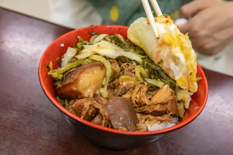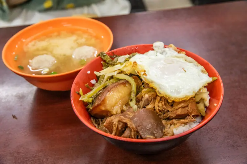 跟在地人一樣點了爌肉飯+味增貢丸湯,這樣一整組110元,大碗爌肉飯裡有爌肉、酸菜、醃薑和半熟荷包蛋。我選擇了綜合爌肉,這樣肥瘦相間的口感MIX在一起非常剛好。