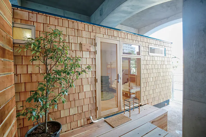 ▲木造的貨櫃屋設計時尚,看出去便是綠意與大岡川。