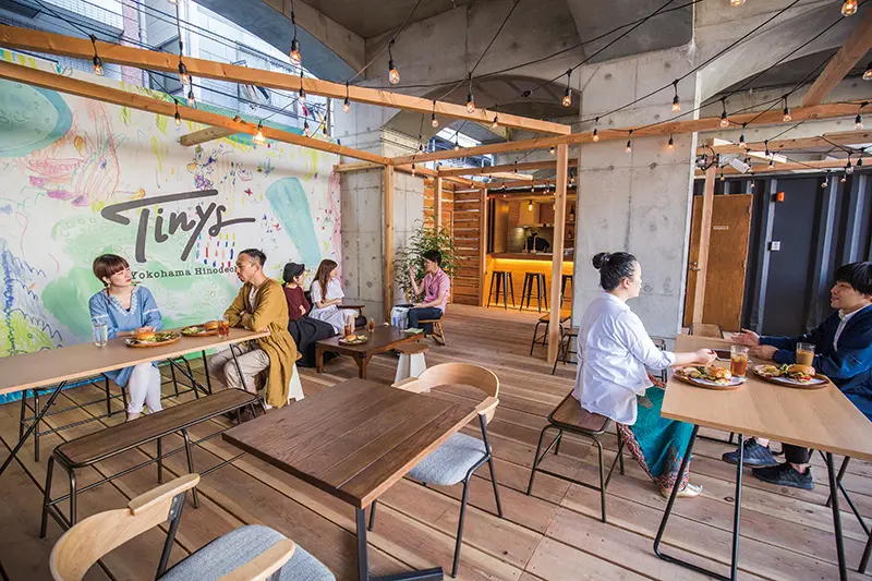 ▲位於高架橋下的貨櫃屋設施Tinys Yokohama Hinodecho,上方便是呼囂而過的京急電鐵。