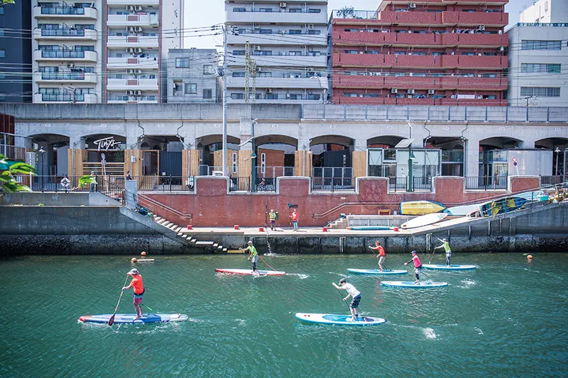 ▲近日在日本掀起風潮的SUP水上活動,在一旁的大岡川上就能體驗,附設的水上運動據點「Paddlers+」提供更衣室、淋浴間、置物櫃等設施。