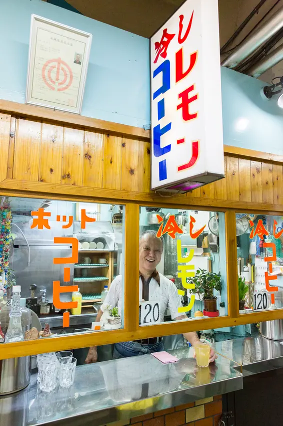 滿是生鮮魚獲、干物的市場1樓,隱身於小小角落的飲料站「コーヒースタンド小嶺」,從招牌開始就是滿滿的復古風情。菜單只有冰咖啡、熱咖啡、冰香檬汁3種,點餐後由笑容滿面的老闆會親自將滿得滿滿的飲料端到眼前。炎熱的午後喝上一杯透心涼的沖繩香檬汁,已是來到第一牧志公設市場的必備行程!
