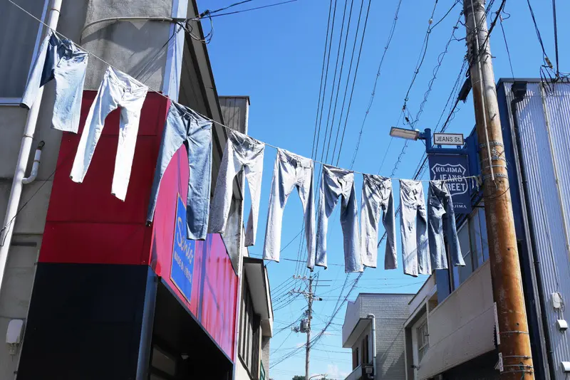 ▲懸掛在電線杆之間的牛仔褲,已成為兒島牛仔褲街的招牌標誌!