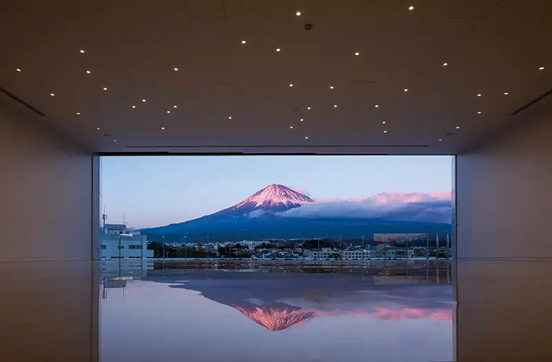 ▲以100%靜岡縣產的「FUJI HINOKI MADE」檜木製造,顛倒富士的形狀在水面上倒映成富士山的樣貌,由建築設計之美感受不一樣的富士山。