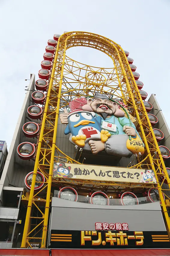 ▲相信所有去過大阪的人都曾目睹過的地標,沿著唐吉訶德道頓堀店設計的橢圓摩天輪,中間巨大的惠比須神與唐吉訶德企鵝吉祥物相當醒目。