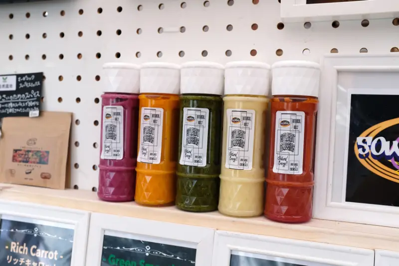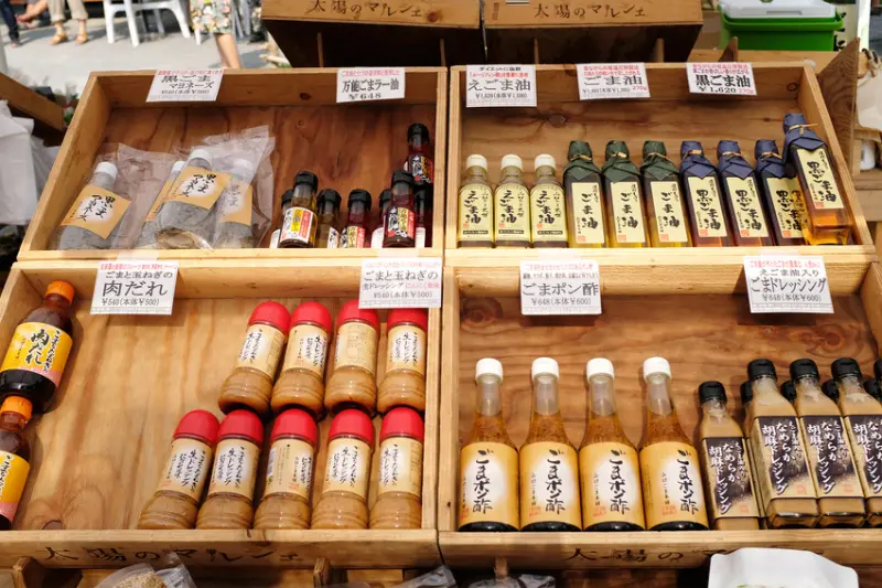 當場現磨的芝麻粉,香氣四溢,不禁被濃郁的芝麻香所吸引!攤位上還有多種以芝麻為基底製成的調味醬料,用途廣泛,每瓶都別具特色,健康又美味。