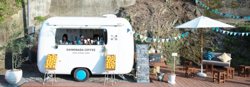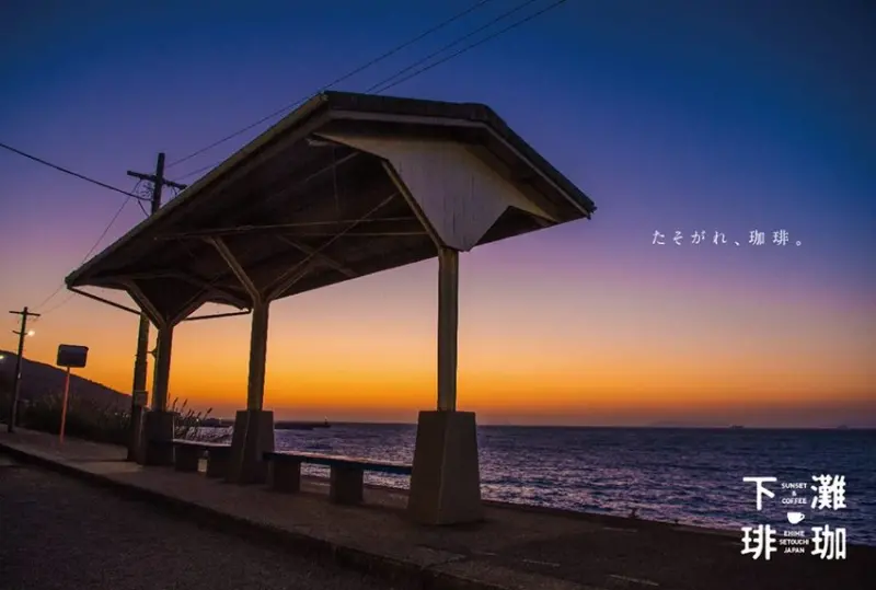 一踏出JR下灘站就能發現純白行動餐車「下灘珈琲」,除了販售手沖咖啡外,另有愛媛盛產的新鮮現榨柑橘果汁,可從愛媛定番的溫州橘、河內晚柑及當季柑橘3種柑橘中選擇,各具風味。點完餐後可在餐車旁的露天座位愜意享用,或坐在下灘站月台椅上一面享受飲品,一面眺望湛藍瀨戶內海海景。