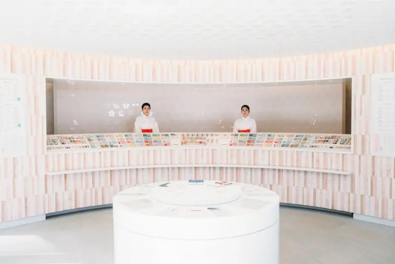 ▲新建造的社務所與御守授予所,深淺不同、有如無數張短冊組成的粉紅色大理石牆面,象徵造訪者們的心願。