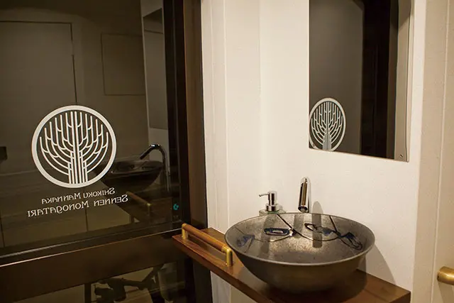 ▲以當地傳統工藝大谷燒特製的洗手台,連車內盥洗空間也別出心裁。