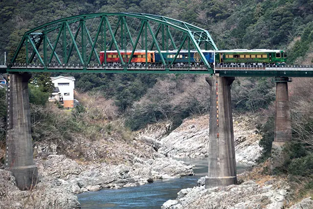 ▲2億年前吉野川流經四國山地切割出「大步危小步危」峽谷成為代表性絕景,列車橫越其中成為經典景致。