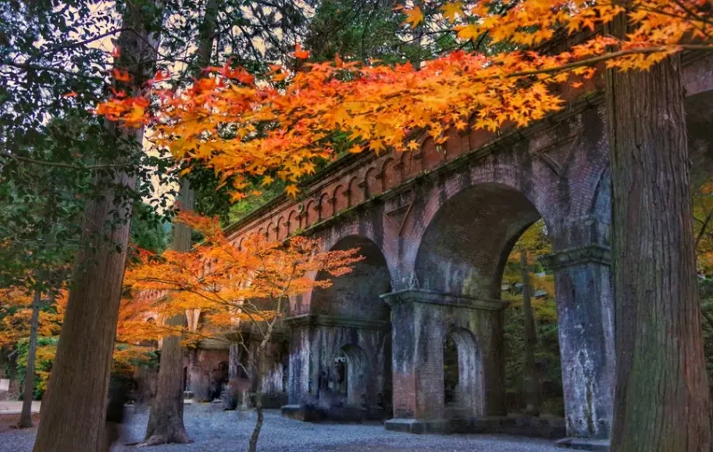 在寺院、神社多如繁星的京都中,南禪寺依然展現出獨樹一格的氣息。創建於13世紀的南禪寺,是日本所有禪寺中最高規格的一座,三門等被列為重要文化財的珍貴建築林立,更特別的是其中還有建於19世紀的琵琶湖疏水道通過,西式磚瓦打造的水路閣,與一旁傳統日式寺院建築形成獨特景觀。秋季能一次享受古寺、西式建築與楓紅交織的美景。