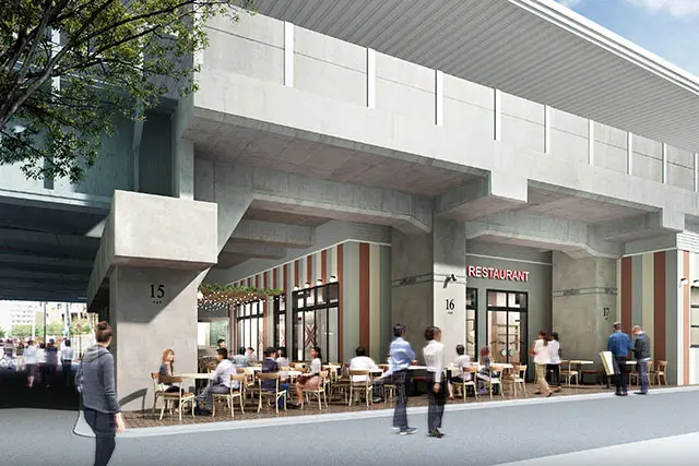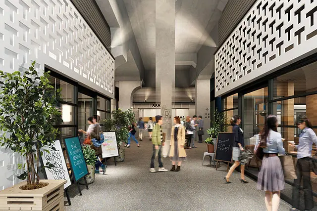 ▲完全利用現有的高架橋下空間,打造出開放感十足的商店街。