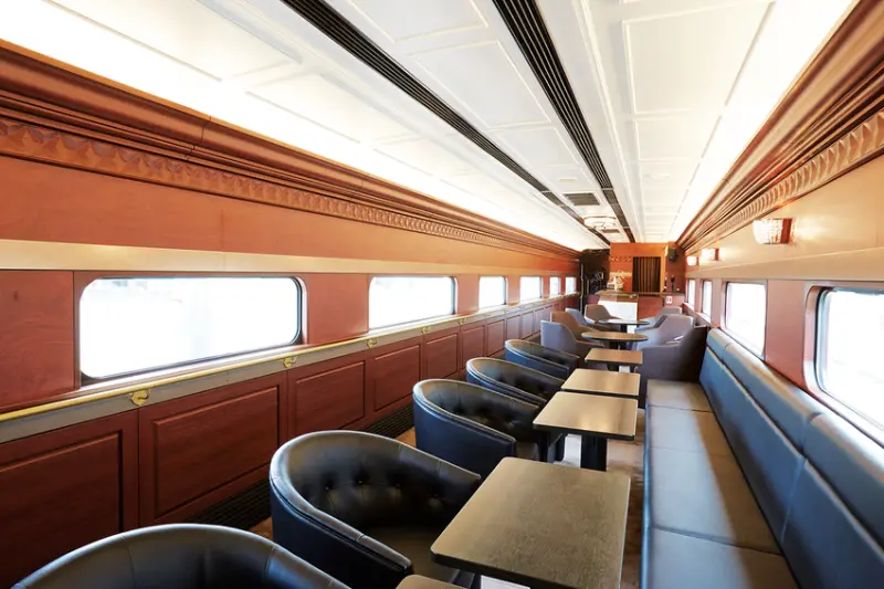 ▲高檔的皮沙發及原木打造的空間,讓人忘記自己身處列車中。