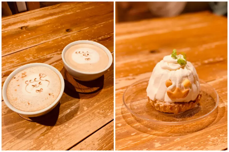 ▲ほんわかカフェラテ(溫和咖啡拿鐵)¥550/口感溫潤的拿鐵配上可愛的拉花,立刻擄獲少女的心。かぼちゃ君ちのモンブラン(南瓜君的蒙布朗)¥530/萬聖節限定造型,選用北海道出產的南瓜製作奶油,口感香濃滑順。