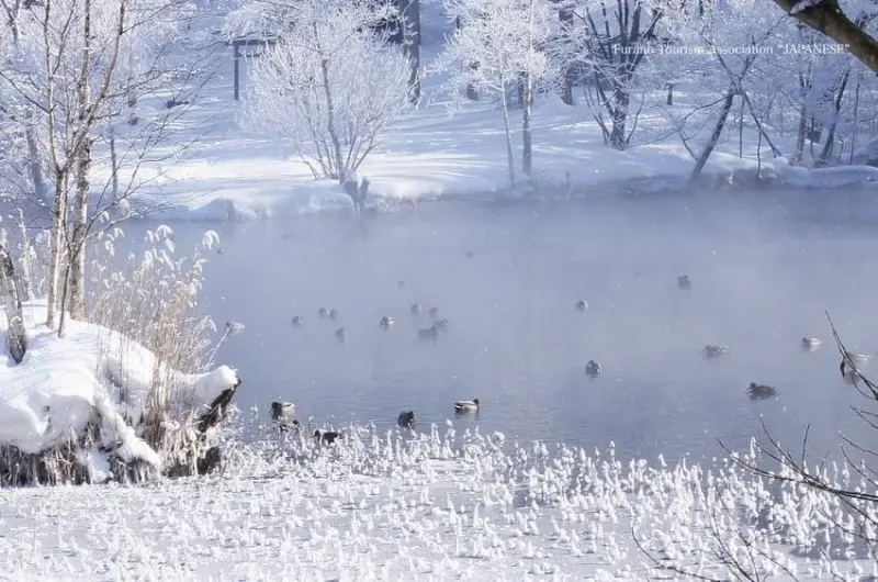 ▲被稱為第2個青池的鳥沼在2016年曾從原本水色轉變成藍綠色,近年因仙境般的飄渺冬景備受矚目 。不會結冰的鳥沼在冬天仍有許多鴨子悠游,搭配樹冰及白霧宛如世外桃源般夢幻。