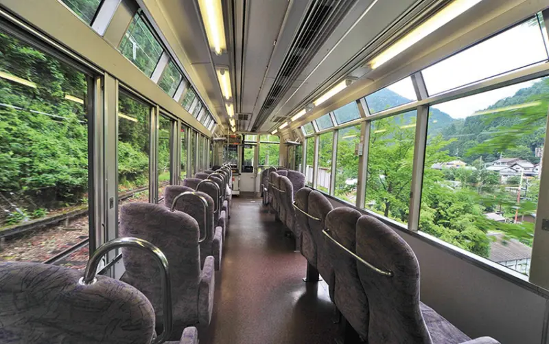 ▲展望列車きらら共有2節車廂,市原站~二之瀨站以及貴船口站附近很多綠樹,形成綠色楓葉隧道。
