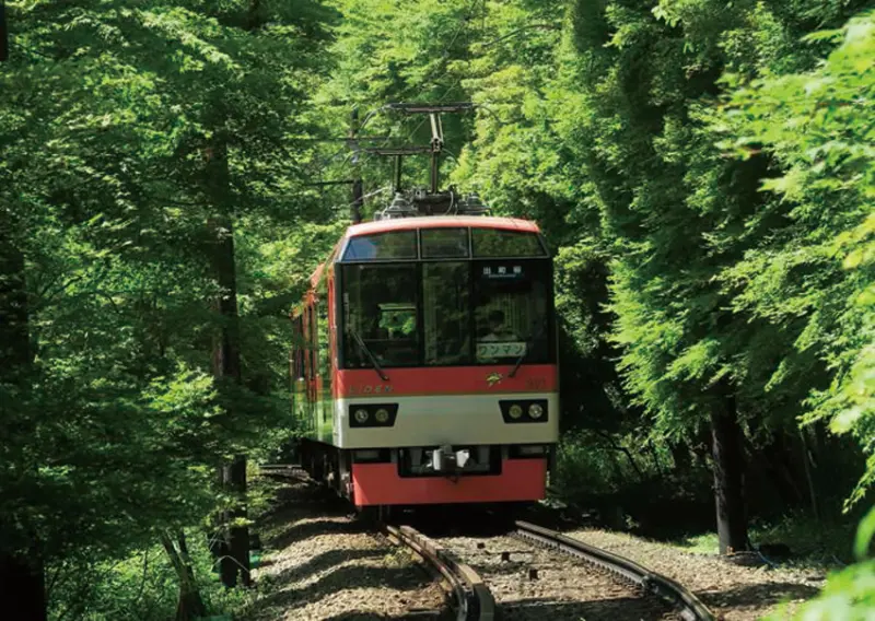 Deo 900型電車是1997年開始行駛的展望列車,習慣稱為「きらら」(KIRARA),面向窗外的雙人座以及大片玻璃窗的設計方式,讓遊客方便觀賞風景,二軒茶屋站至鞍馬站之間為單線軌道,可以感受到森林景致的震撼力,秋天的「楓葉隧道」也不容錯過。