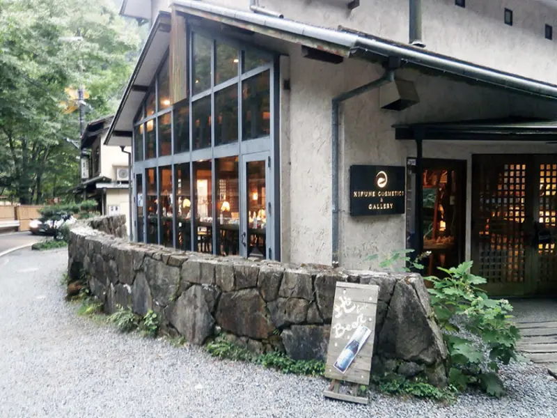 這是「KIFUNE COSMETICS」的旗艦店,誕生自貴船水,除了販售化妝品,也展售家具設計師中島勝壽的家具,以及當地工匠和藝術家製作的作品,還有能量石飾品,它經過貴船水這個能量景點的水洗滌,歡迎來這間藝廊咖啡廳選購。