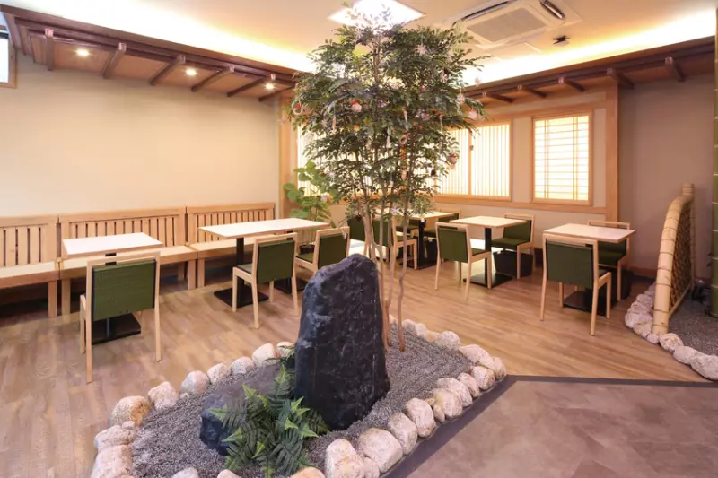 ▲店內寬敞舒適,中央設有枯山水廣園造景,十足日式風情。