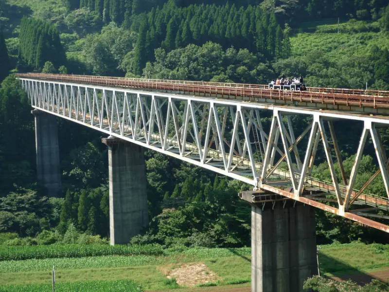 架設於峽谷上高105公尺處的高千穗鐵橋,曾被譽為「東洋第一」的絕景鐵橋。接手廢線的高千穗鐵道,獨特的「高千穗あまてらす鉄道」在2017年推出30人搭乘的小火車「GRAND SUPERCART」,行使於高千穗鐵橋~高千穗站間,從鐵橋上360度環視周邊絕景的震撼畫面大受歡迎。車掌還會在鐵橋上吹起泡泡,讓行程增添浪漫氣息。