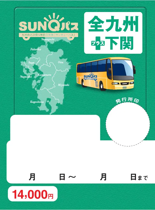 幾乎所有的九州路線巴士、長途巴士皆可使用的划算交通套票「SUNQ Pass」,共結合了數十家巴士公司,只要看到巴士車身上印有SUNQ Pass的LOGO,便可使用套票搭乘,機動性、彈性十足,適合利用此一票券深入九州,前往列車難以抵達的私房景點,玩遍九州。