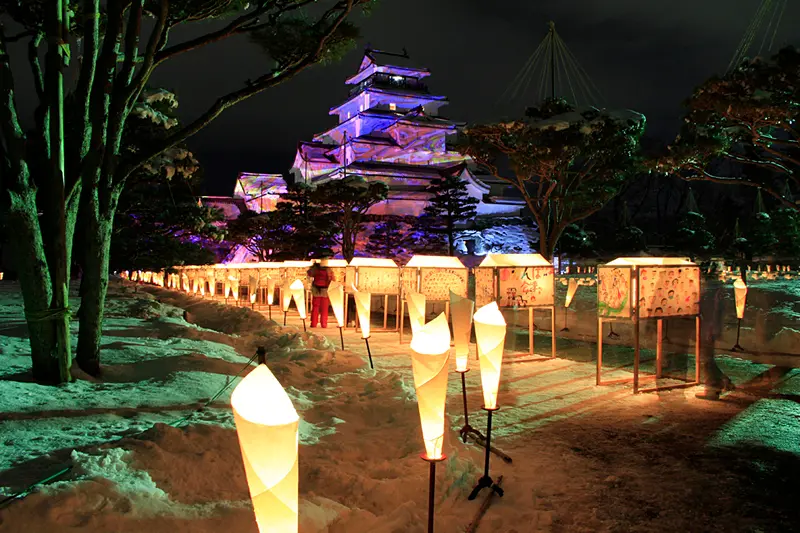 每年2月在鶴之城會擺放彩繪成菊花 、紫藤 、牡丹模樣的蠟燭,數千支蠟燭照亮冬天的夜晚,與雪景交織成不可思議的夢幻景象 。2019年則即將在2/8(五)、2/9(六)舉辦。屆時將能一睹會津地區引以為傲的500年歷史的蠟燭工藝 。