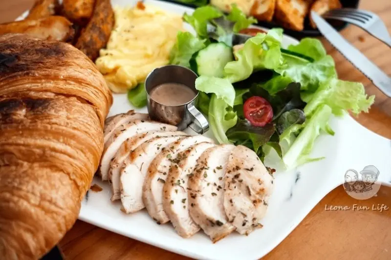 舒肥香草雞早午餐的配置跟唐揚雞的一樣,不過麵包的部分友人則選擇搭配可頌,雞肉柔嫩佐著香草氣息,味道上算是十分清爽。