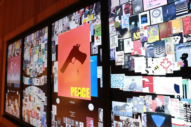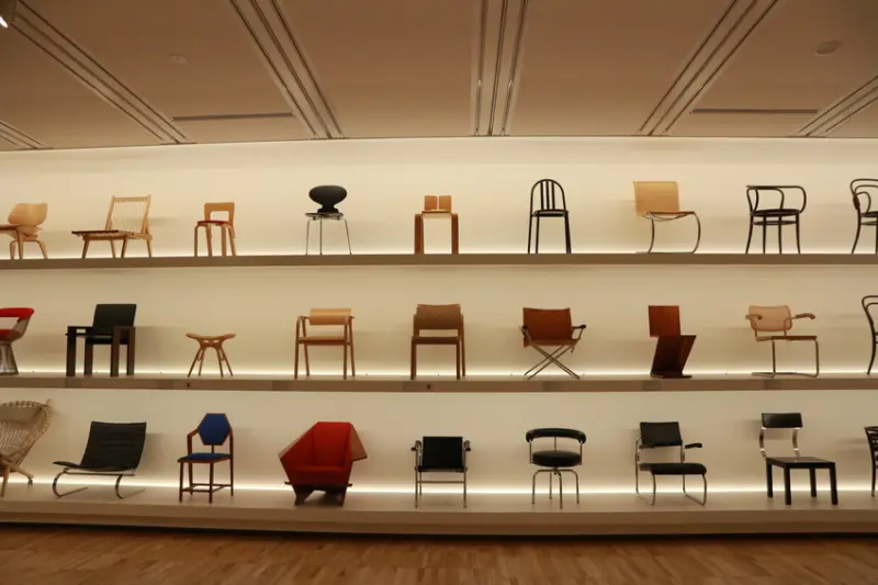 ▲集結了來自世界各地240張椅子,是這裡獨特的收藏品,每1張都大有來頭。還有各個年代的創意海報一字排開,除了實體海報外,也有數位版可觀看。