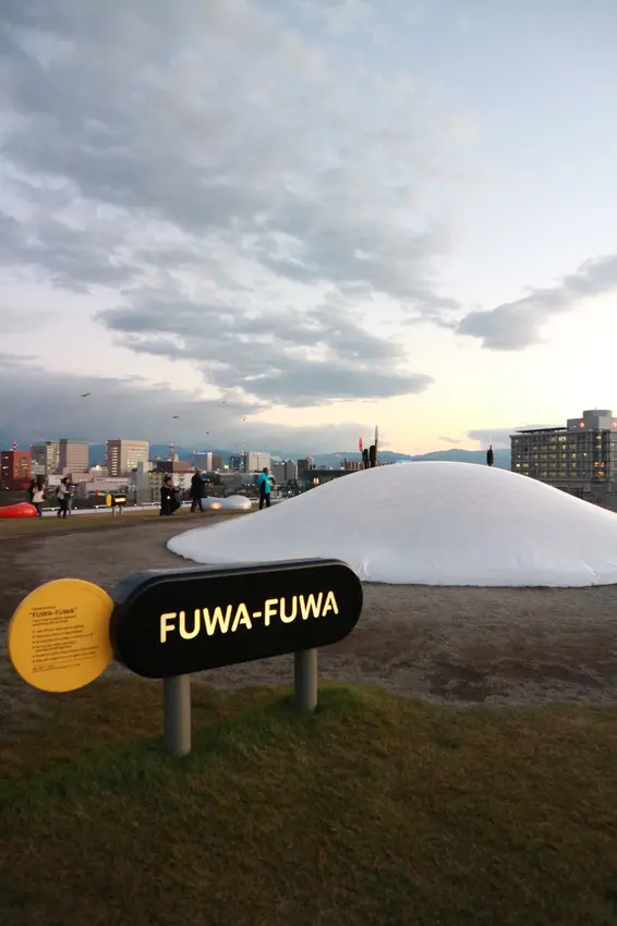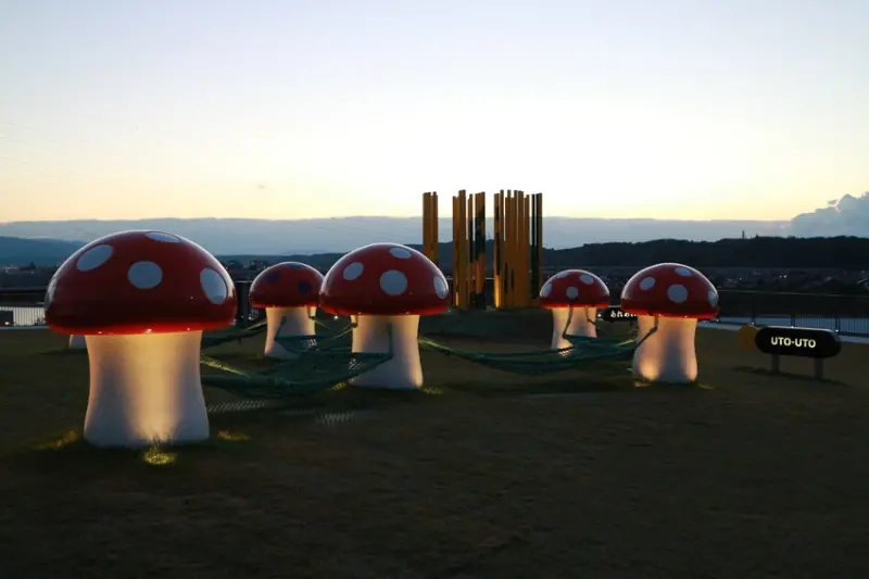 免費開放的屋頂庭園也是充滿創意的藝術空間,以各個日文「擬聲語」為主題打造出多樣的裝置藝術,能肆意拍照、休憩,同時可眺望一旁的富岩運河環水公園美景。