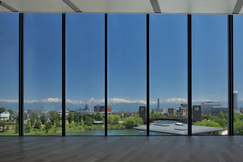 ▲從富山縣美術館2樓挑高空間,也能看到環水公園與北阿爾卑斯山的美景。