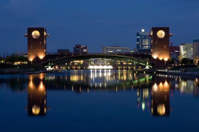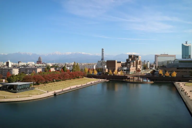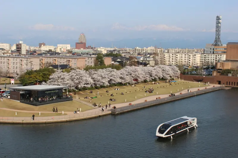 就位於富山縣美術館對面的富岩運河環水公園,沿著長5.1公里、直通日本海的富岩運河所建,規劃良好的水岸道路、綠地,曾獲頒都市公園獎中的最優秀獎。園內地標為長58公尺的天門橋,入夜還會點燈,白天夜晚都美不勝收。其中還有被譽為「世界最美」的星巴克咖啡,春季時店外櫻花沿河盛開,能享受獨一無二的美景。