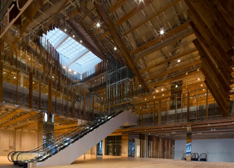 ▲自天窗引入自然光線照亮整個大廳,富山產的杉板、玻璃、錯面交錯,展現出開放感十足的獨特空間。