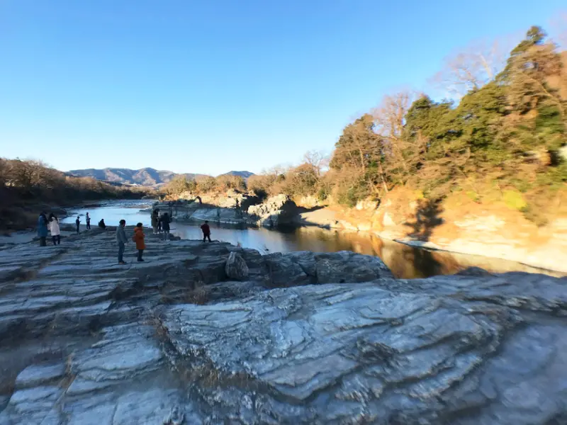 從長瀞車站出發約步行5分鐘即可到達,一路上有很多商家可以吃吃逛逛。長瀞岩疊不愧是國家指定名勝,來朝聖拍照的人真不少!每個角度的景色都別具特色,冬天金黃的樹木映照在河面上,波光粼粼,相信不同季節來都會有不一樣的驚喜!
