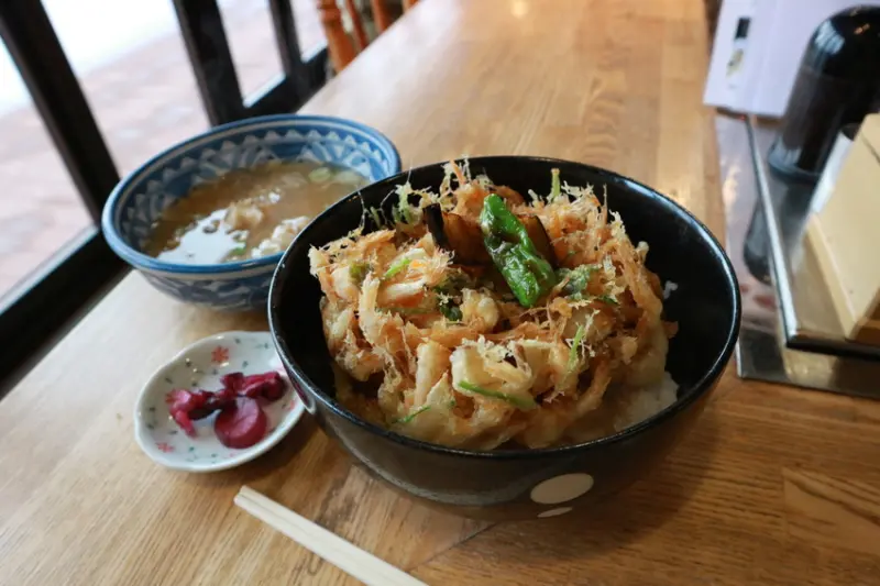 ▲しろえびかき揚げ丼(炸白蝦什錦丼)¥1200/來到富山必吃的白蝦丼,連皮一起酥炸的白蝦外酥內嫩,當配魚湯、醃菜品嚐。