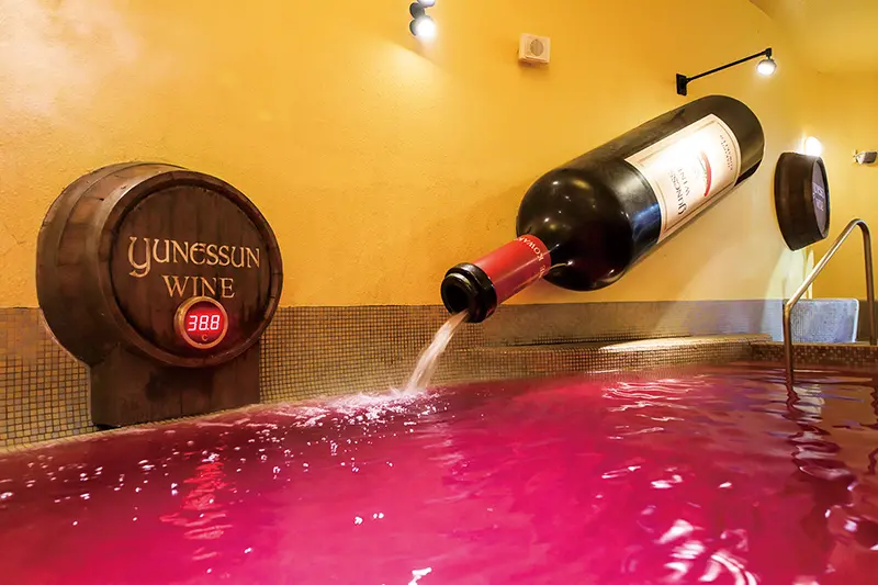 ▲葡萄酒浴巨大的酒瓶令人不禁會心一笑,是大受女性顧客喜愛的湯泉。