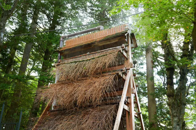 ▲美術館所提供的足湯溫泉是將滾盪溫泉經過冷卻裝置「湯雨竹」降溫而使用。