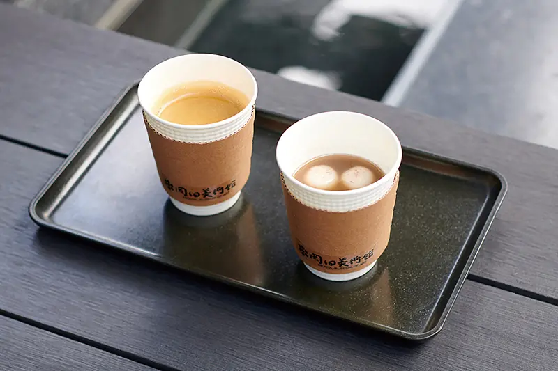 ▲邊泡足湯邊來杯「プレミアムコーヒー(精品咖啡)」¥400、或「おしるこ(紅豆年糕湯)」¥500。