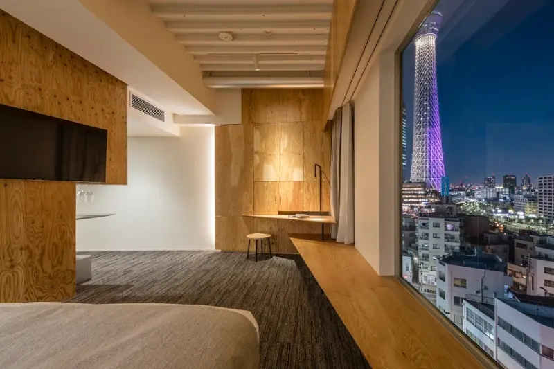 2017年7月開幕、位在東京下町押上的ONE@Tokyo,周邊除了保有江戶風情之外,還有以東京晴空塔為主的現代化街景,是現代都市的洗鍊感與傳統人情味交融的地方。旅宿由建築大師隈研吾設計監修,以簡潔外觀為主,搭配來自當地工廠所產的木材,成功將工業素材與自然素材融合,打造出高格調的建築空間。客房分為5種房型,除了透過房間窗戶眺望東京晴空塔之外,還能到屋頂露台欣賞。