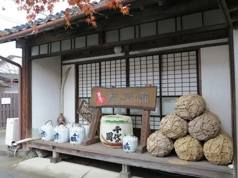 ▲資料館入口相當有和風情懷,酒造資料館收藏許多古老的釀酒用具,能見識到許多昔日用具與酒瓶等 。