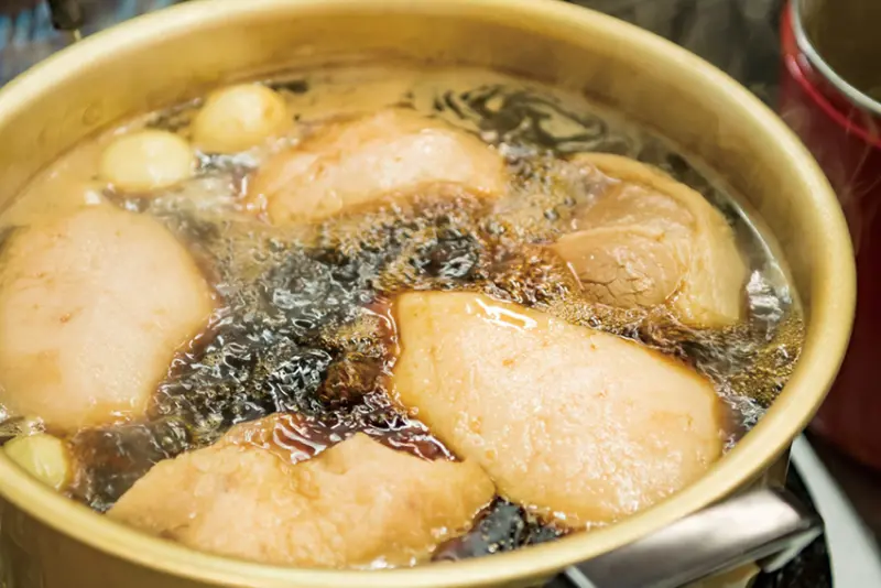 ▲用大鍋燉煮的叉燒令人垂涎,帶有肉汁的醬油也是拉麵的調味醬料。