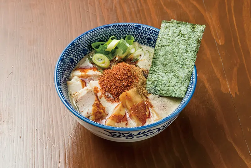 2018年夏季搬遷新址的人氣拉麵店,依然天天大排長龍,展現超強實力。曾在東京拉麵名店「井の庄」研習的老闆以豚骨、雞肉乾、柴魚等多項食材熬煮出帶有魚貝類鮮甜滋味的超濃湯頭,搭配東京「三河屋製麵」的極粗麵條製成的沾麵坐擁超強人氣,一改傳統博多豚骨拉麵的變化球,令人驚豔。