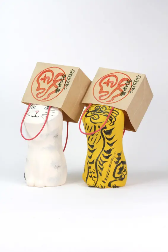▲將於伴手禮店販售的貓型博多人偶「福かぶり猫(招福貓)」由於日文「袋」與「福」發音相近因此頭戴袋子,特別設計的貓咪花紋是美術館限定商品。