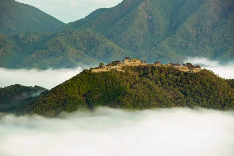 藏身於雲海中的古老城跡,座落在古城山山頂上,遠看山體宛如一隻猛虎俯臥在此,故又稱為「虎臥城」,雖然現今只留下基座的石垣,仍為日本國內古城遺跡中頗具規模的。每逢秋季天晴時,早晨容易形成濃霧,被雲霧包圍的竹田城彷彿飄浮在雲海上,因而被稱作「天空之城」。