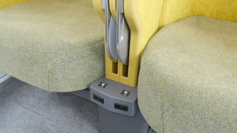 ▲座椅都附有插座,能隨時充電、辦公,椅背與扶手都設有收納桌,相當便利。