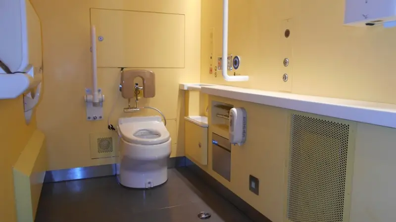 ▲車內設有一般廁所、多功能廁所,也以柔和的黃色為設計基調。